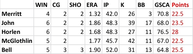 Scoring is on a points system, since five qualified, best in category gets 5 next 4 and so in. If a tie happens, points are added up and divided by number tied.