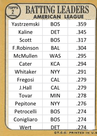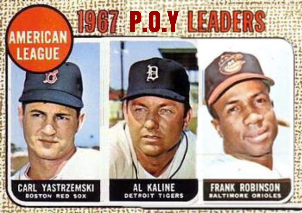 To determine the Player of the Year, the main batting statistical categories are used. The leader boards is assembled and points are established for each place, 1st place is 10 points down to 10th which is with 1 point. If a player is tied on a particular category, the sum of the place points are added together then divided by the number sharing that total. For instance, Bob Allison and Paul Blair both lead the league with 11 tripled. So I add 10 points for 1st and 9 for second thus each player gets 9.5 points. So, not that it should be a surprise, but here us the race as August comes to a close.